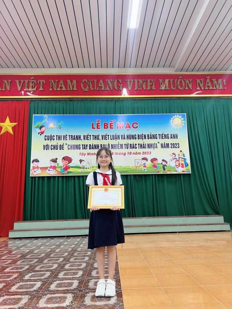 Em Nguyễn Trịnh Bảo Uyên - Lớp 5G vinh dự đại diện đơn vị Thành phố Tây Ninh dự thi thể loại Hùng biện bằng tiếng Anh đạt giải NHẤT.